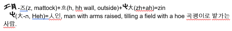 • (人) and 大 are exchaneable term, and original script 大 locating bottom of these two scripts(), and three together are (+大=ㅅ+hh+ah=Zin). (Heh, ה) plus erets(ארץ) becomes ha’erets “the land”(Introduction to Ancient Hebrew, Jeff A. Benner). The script  ה, Hey, has been used for 10 century BC, and  as a third script of